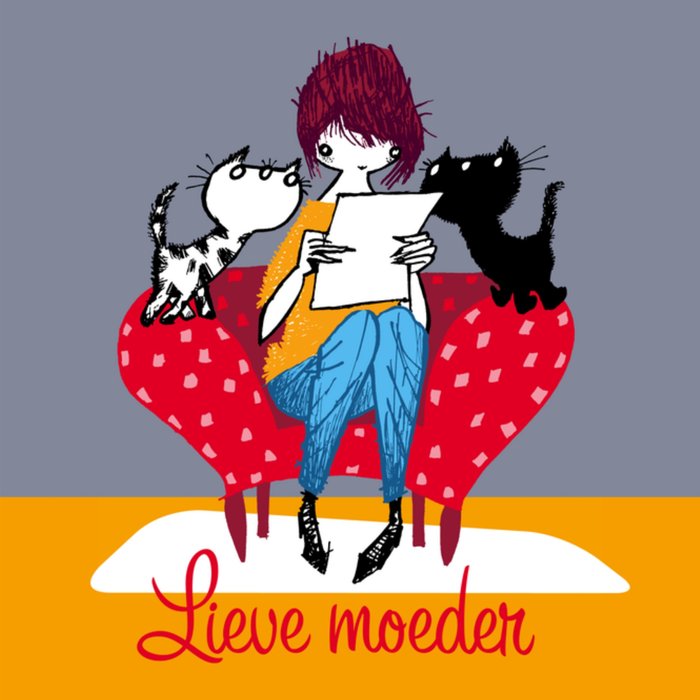 Een grappige kaart voor Moederdag om je moeder eens mee te verrassen. Pim & Pom lezen met moeder mee.