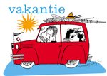 Een zonnige vakantiekaart met Pim & Pom in de auto.
