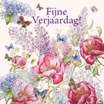 Vrolijke verjaardagskaart van Janneke Brinkman, met vlinders en bloemen.