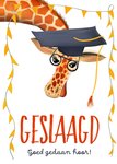 Vrolijke geslaagdkaart met een giraffe met een bril en een afstudeerhoed op. De tekst is: Geslaagd! Goed gedaan hoor. De tekst is niet aanpasbaar.