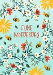 Vrolijke Moederdagkaart met bloemen en bijtjes. De tekst is ‘Fijne Moederdag’.