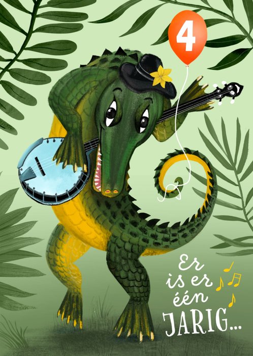 Verras een jarige met deze grappige verjaardagskaart met een illustratie van een krokodil met een banjo en een ballon. De leeftijd is aanpasbaar.