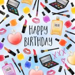 Verras iemand met deze kleurrijke verjaardagskaart met illustraties van make-up en parfumflesjes. De kaart is niet aanpasbaar.