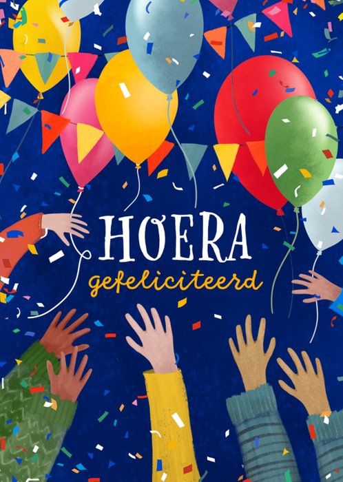 Verras een jarige met deze vrolijke verjaardagskaart met een illustraties van ballonnen, slingers, confetti en handen. De kaart is niet aanpasbaar.