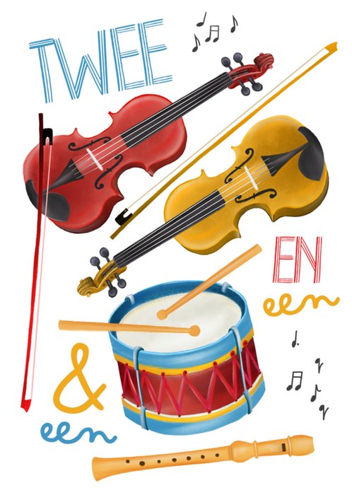 Vrolijke verjaardagskaart met tekst en illustraties van twee violen en een trommel en een fluit. De tekst is niet aanpasbaar.