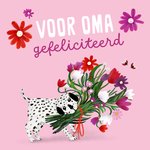 Lieve verjaardagskaart met hondje met bos bloemen in zijn bek. De tekst is: Voor oma, gefeliciteerd. De tekst is niet aanpasbaar.