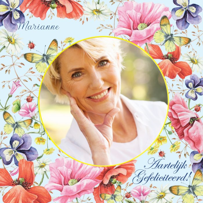 De foto op de voorkant van de kaart is omringd door bloemen en vlinders. De naam op de kaart is aanpasbaar.