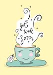 Gezellig beterschapskaartje met daarop een theekopje en de tekst: "Get well soon" De vrolijke kaarten van Funny Side up zijn voor ieder moment, een mix van illustraties, design en kunst. Alle ontwerpen zijn met de hand getekend in speelse kleuren, vormen en karakters.