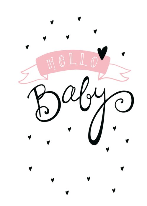 Schattig geboortekaartje voor een meisje met zwarte, witte en roze kleuren en daarbij de tekst "Hello Baby" Toch op zoek naar een ander design? Bekijk