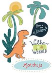 Stoere geboortekaart met aanpasbare naam en dino.