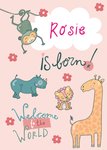 Vrolijke geboortekaart met naam en illustratie.