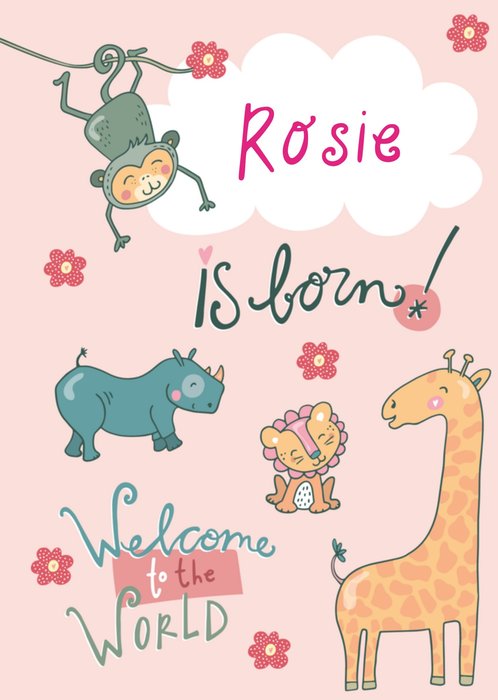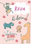 Vrolijke geboortekaart met naam en illustratie.
