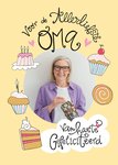 Kleurrijjke verjaardagskaart met illustraties van taartjes, cupcakes, hartjes, aanpasbare foto en de tekst: 'Voor de allerliefste oma. Van harte gefeliciteerd'. Verras je jarige oma met deze typografische en leuke verjaardagskaart van Funny Side Up.