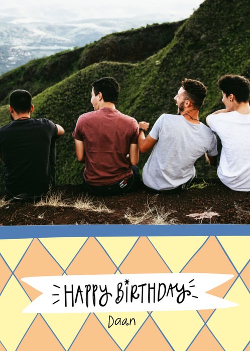 Kleurrijjke verjaardagskaart met aanpasbare foto en de tekst: 'Happy birthday'. Verras de jarige met deze typografische en leuke verjaardagskaart van Funny Side Up.