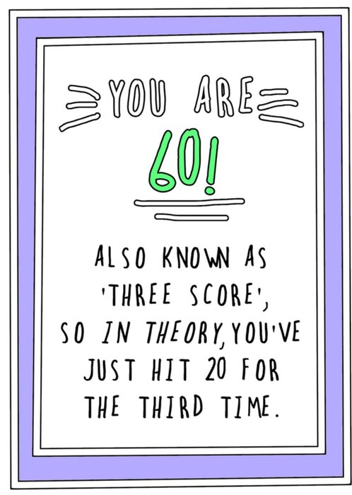 Hiep hiep hoera! Jij kent iemand die jarig is. Stuur deze verjaardagkaart om te feliciteren. Op de kaart staat: You are 60. Also known as three score. So in theory you've just hit 20 for the third time.