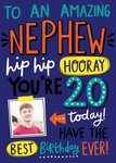 Kleurijke fotokaart met de tekst: To an amazing nephew hip hip hooray you're 20 today have the best birthday ever!
