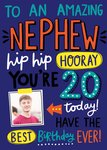Kleurijke fotokaart met de tekst: To an amazing nephew hip hip hooray you're 20 today have the best birthday ever!