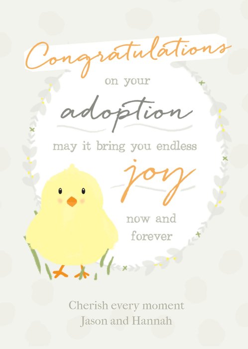 Ken jij iemand die na een lange adoptieprocedure eindelijk goed nieuws heeft gekregen? Stuur dan deze leuke kaart van Greetz. Op de kaart staat: Congratulations on your adoption. May it bring you endless joy now and forever. Je kunt ook een naam toevoegen.