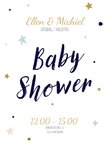 Leuke babyshower uitnodiging van Greetz. Met grote letters staat er babyshower. Onderaan de kaart kun je info van het feestje zetten. Om de tekst heen is een kader met stipjes.