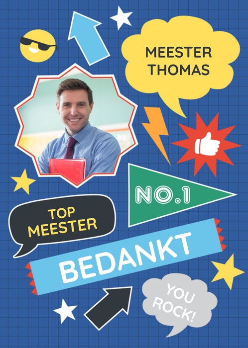 Leuke fotokaart met aanpasbare naam voor een top meester.