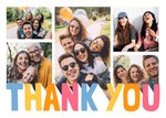 Een levendige en oprechte bedankkaart met een aanpasbare fotocollage-indeling. De opvallende, veelkleurige "THANK YOU"-typografie voegt een vrolijke en moderne touch toe, waardoor deze kaart perfect is om op een unieke en persoonlijke manier dankbaarheid te tonen aan vrienden, familie of collega's.