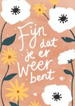 Een vrolijk kaartje met bloemetjes om iemand welkom thuis te heten. "Fijn dat je er weer bent"