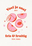 Leuke beterschapskaart met illustratie van fruit en de tekst: Voel je snel weer firs & fruitig lieve mama.