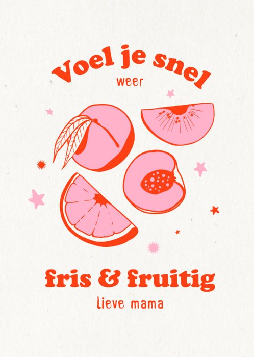 Leuke beterschapskaart met illustratie van fruit en de tekst: Voel je snel weer firs & fruitig lieve mama.