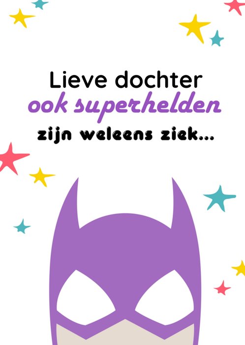 Is je liever dochter ziek? Stuur haar daarom een beterschapskaart om haar op te vrolijken van Greetz. Op deze kaart staat: lieve dochter, ook superhelden zijn weleens ziek...