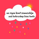 Wil jij je tante beterschap wensen? Doe dat dan met een beterschapkaart van Greetz! Op deze kaart staat: na regen komt zonneschijn. Veel beterschap lieve tante.