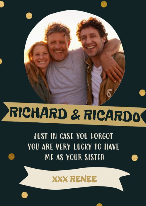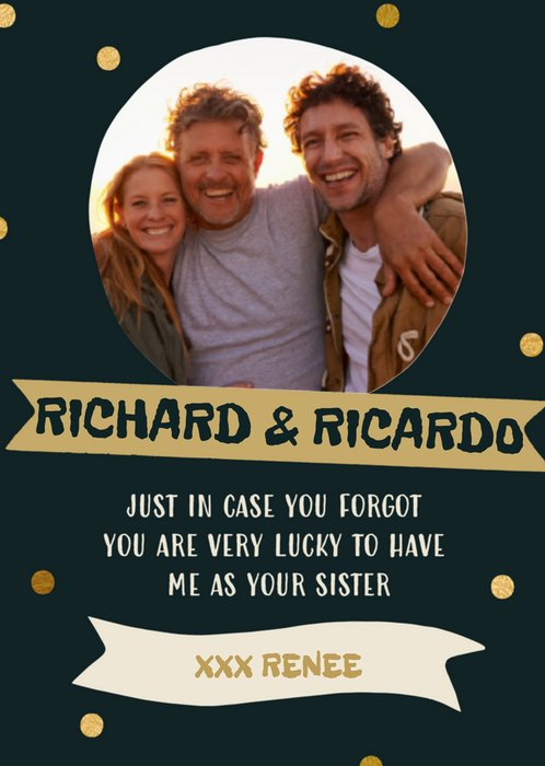 Op deze broer- en zus dag kaart kun je een leuke foto toevoegen en je broers of zussen mee verrassen. De namen zijn aanpasbaar.