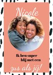 Op deze leuke kaart staat de tekst: Ik ben super blij met een zus als jij! Je kunt de naam van je zus toevoegen en een leuke foto.