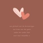 Stuur je steun op met deze condoleancekaart. Op de kaart zie je een illustratie van een twee roze hartjes met de tekst: Een glimlach voor de herinneringen, een traan voor het gemis, omdat het zonder haar nooit meer hetzelfde is.