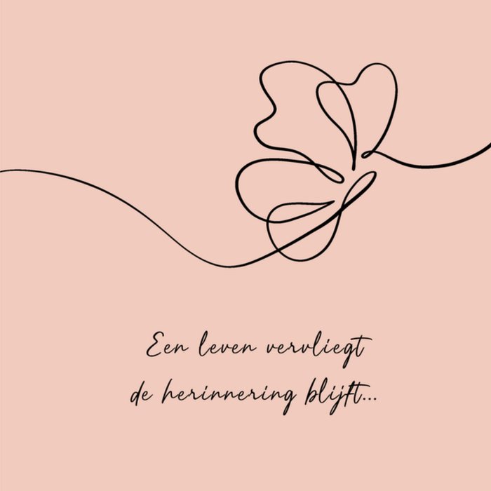 Stuur je steun op met deze condoleancekaart. Op de kaart zie je een illustratie van een line-art vlinder met de tekst: Een leven vervliegt, de herinnering blijft... Voeg je eigen foto('s), tekst, & versiering toe om de kaart extra persoonlijk te maken. Je kunt de kaart toevoegen aan je favorieten of tussentijds opslaan om deze later af te maken.