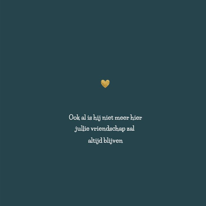 Iemand verliezen is altijd erg. Wens iemand daarom sterkte met deze mooie condoleance kaarten van Greetz. Op de kaart staat de tekst: ook al is hij niet meer hier jullie vriendschap zal altijd blijven.