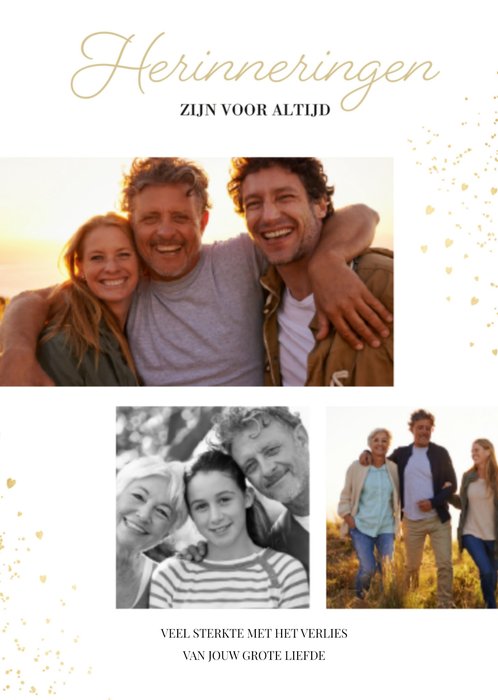 Iemand verliezen is altijd erg. Wens iemand daarom sterkte met deze kaart met de tekst: Herinneringen zijn voor altijd. Veel sterkte met het verlies van jouw liefde.