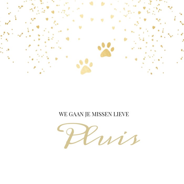 Een huisdier verliezen is altijd erg. Wens iemand sterkte met deze mooie condoleance kaart met de tekst: We gaan je missen lieve Pluis.