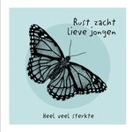 Mooie condoleancekaart met illustratie en de tekst: Rust zacht lieve jongen. Heel veel sterkte.