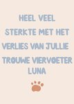 Op deze condoleancekaart staat: Heel veel sterkte met het verlies van jullie trouwe viervoeter [naam]