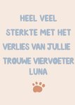 Op deze condoleancekaart staat: Heel veel sterkte met het verlies van jullie trouwe viervoeter [naam]