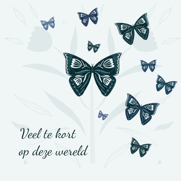 Een baby verliezen is verschrikkelijk. Stuur daarom deze mooie kaart met vlinders en de tekst: Veel te kort op deze wereld.