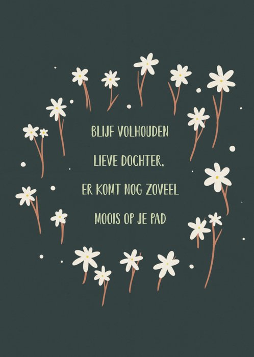 Mooie denken aan kaart met bloemen die je naar je dochter kunt sturen met de tekst: Blijf volhouden lieve dochter, er komt nog zoveel moois op je pad.