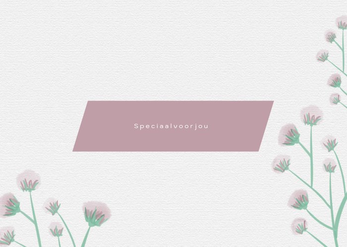 Een rustig design met paardenbloemen aan de zijkanten. Midden op de kaart staat een blok waarvoor je zelf een tekst kan verzinnen.