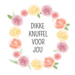 Op de kaart staat een cirkel van verschillende kleuren rozen en rozenbladen. In het midden kan je zelf een persoonlijke tekst toevoegen.