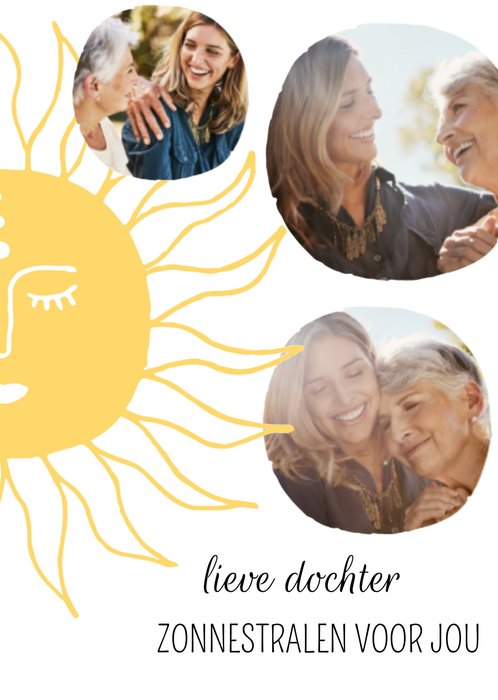 Mooie denken aan kaart met een zon erop. Stuur deze kaart naar je dochter met de tekst: Lieve dochter zonnestralen voor jou. Voeg drie eigen foto's toe.