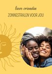 Leuke denken aan kaart om naar een vriendin te sturen met een zon op de kaart en de tekst: Lieve vriendin zonnestralen voor jou. Voeg een leuke foto toe.