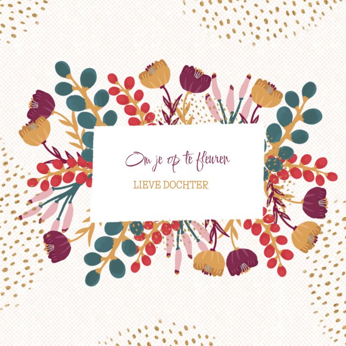 Fleurige denken aan kaart die je naar je dochter kunt sturen met de tekst: Om je op te fleuren. Lieve dochter.