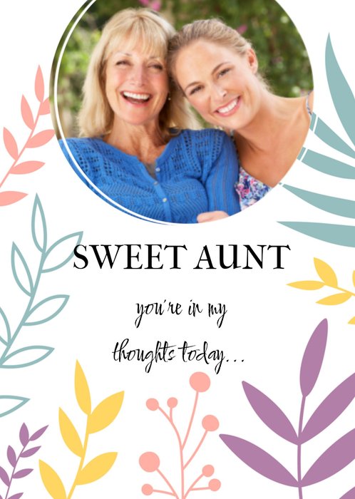 Lieve denken aan kaart met verschillende gekleurde takjes op de kaart. Stuur deze denken aan kaart naar je tante om haar te laten weten dat je aan haar denkt met de tekst: Sweet aunt you're in my thoughts today... Je kunt een eigen foto toevoegen.