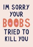 Laat weten dat je aan iemand denkt met deze wenskaart met de tekst: Im sorry your boobs tried to kill you.