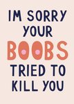Laat weten dat je aan iemand denkt met deze wenskaart met de tekst: Im sorry your boobs tried to kill you.
